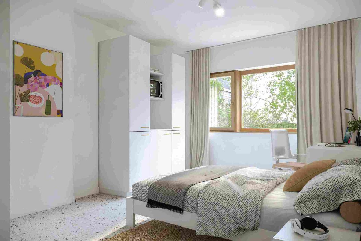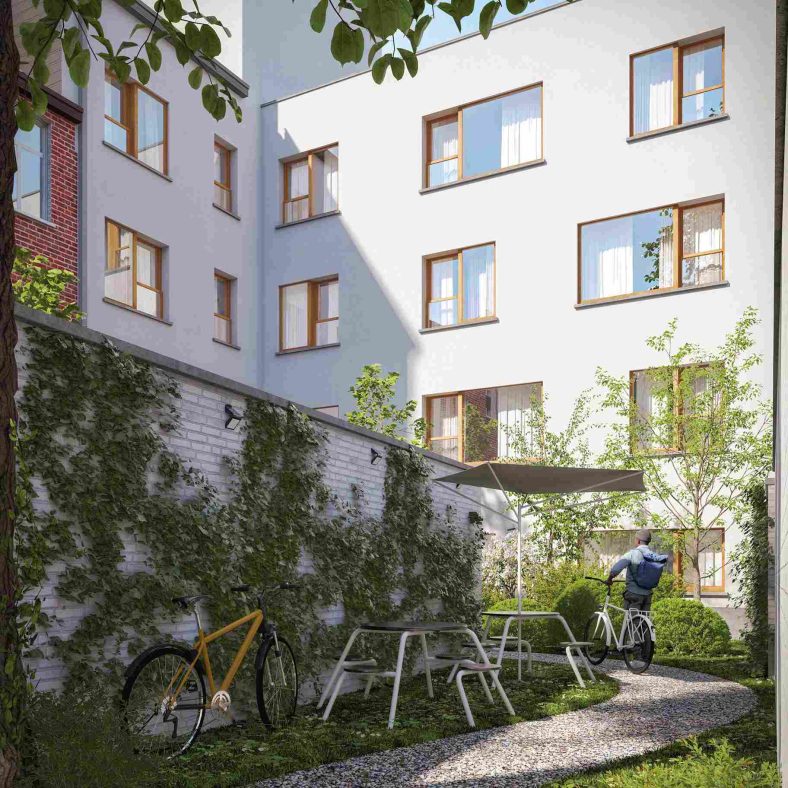 Het statige hoekgebouw telt 35 studentenkamers met eigen sanitair en 6 autonome studio’s, verspreid over vijf niveaus. Op elke verdieping is een volledig ingerichte gemeenschappelijke keuken voorzien. Bewoners hebben daarnaast toegang tot een aangelegde binnentuin.