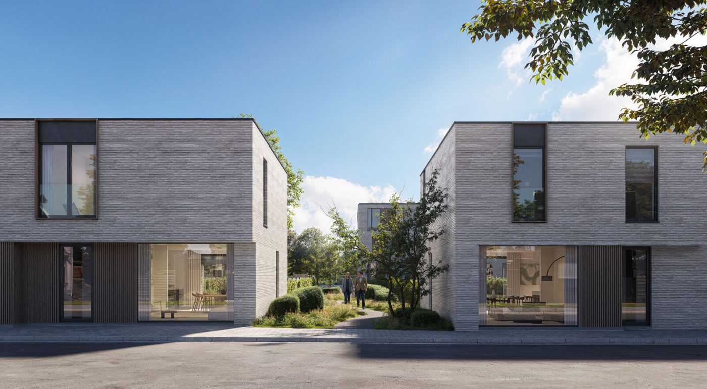Aan de voorzijde van het project bevinden zich 12 energiezuinige woningen met 3 slaapkamers en een bureel, mooie tuinen en 2 tot 3 privatieve parkeerplaatsen.