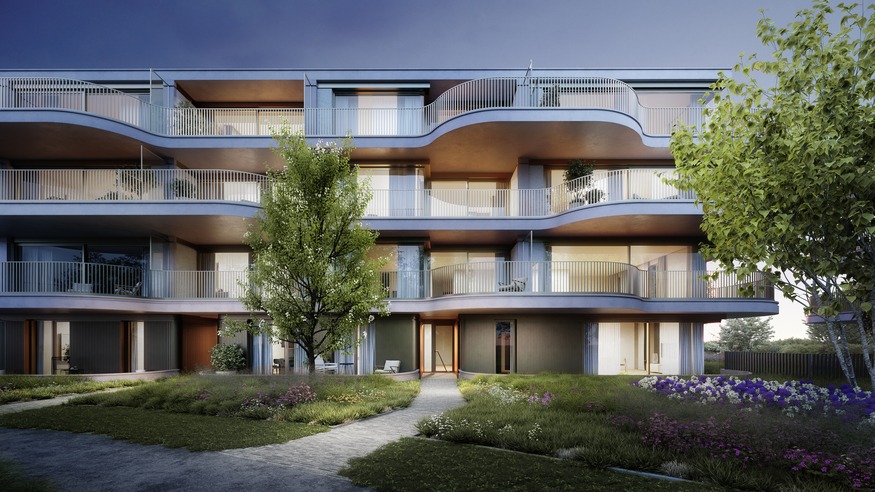 Elke woonunit beschikt over een ruim terras en kijkt uit op een prachtig aangelegd buurtpark van meer dan 1 hectare, met wandelpaden en een sfeervolle vijver.